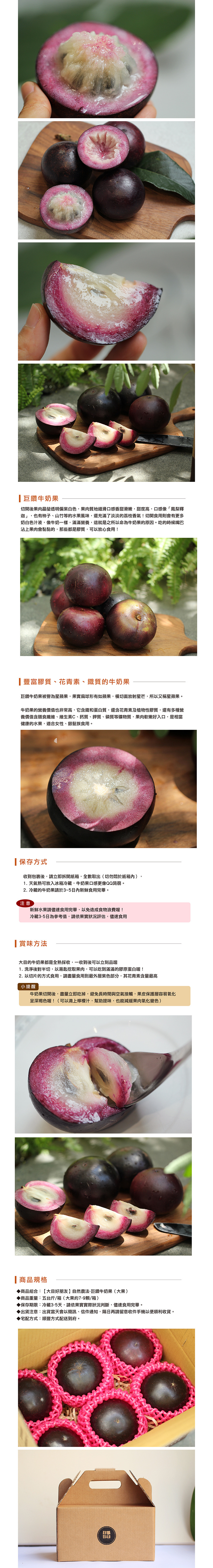 巨鑽牛奶果外皮是漂亮的深紫色,切開後果肉呈現紫白色,質地細緻、柔滑。成熟的果實甜度高,香氣濃郁。